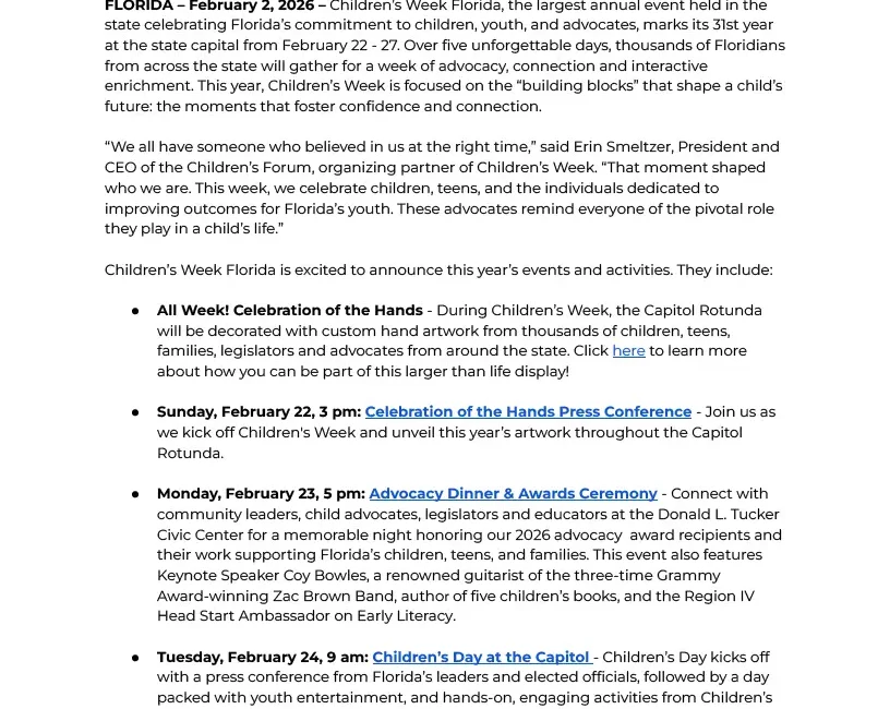 Get Ready for Children’s Week Florida 2026! Download Version Download 58 File Size 63.11 KB File Count 1 Create Date February 2, 2026 Last Updated February 18, 2026 Get Ready for Children’s Week Florida 2026! Attached Files 1 file CW 2026 General Event_Press Release.pdf63.11 KBDownload