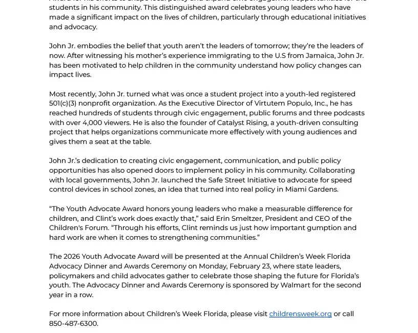 South Florida Student Leader Clint John Jr. Honored with 2026 Youth Advocate Award
