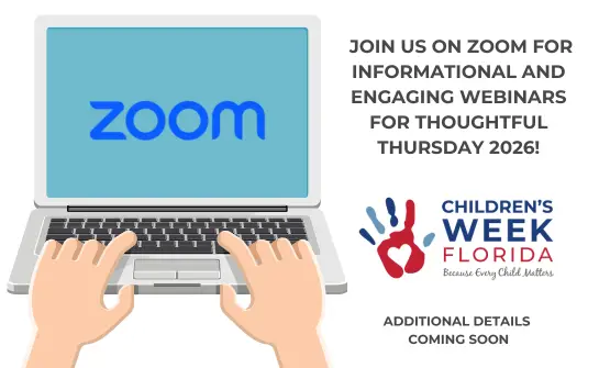 Stay tuned for more information on this year’s topics, presenters, and how to register! You can view our previous Thoughtful Thursday recordings on our Children’s Week Florida YouTube page.